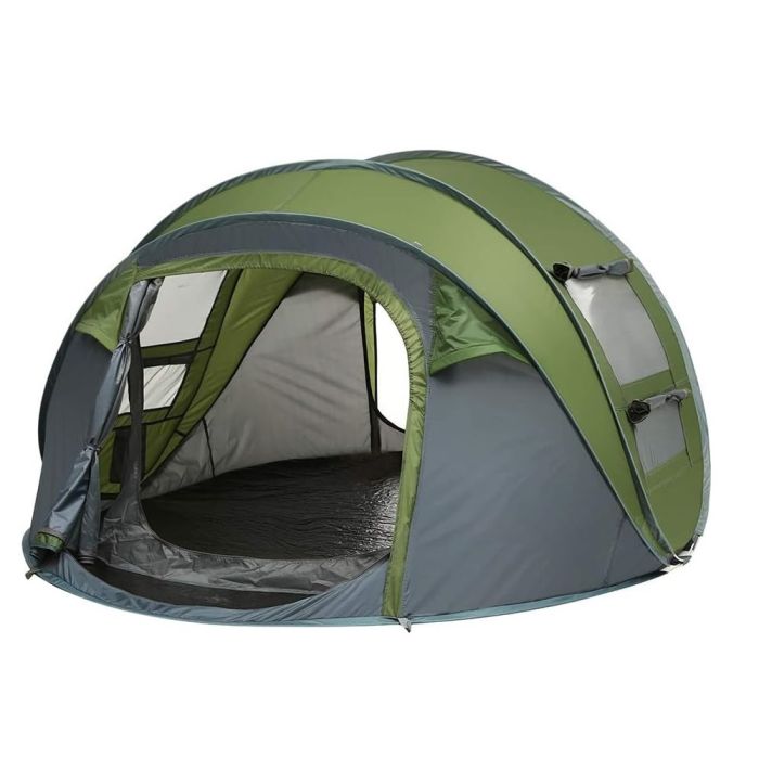 خيمة عائلية واسعة، تتميز بجدران منحنية مع تهوية ممتازة بفضل النوافذ المزودة الشبكية. مصنوعة من نايلون وبوليستر مقاوم للماء يضمن لك الحماية. خيمة مثالية للأنشطة الخارجية والرحلات مع سهولة في التركيب والتخزين
