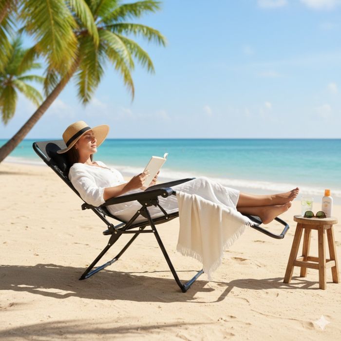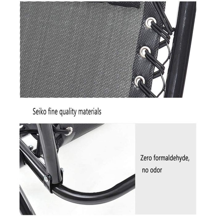 تصميمه المدمج والمرن يجعل أي مكان مناسباً للاسترخاء، حيث يتحول بسهولة من كرسي عادي إلى وضعية استرخاء لكامل الجسم، مصنوع من قماش textilene يسمح بمرور الهواء مع أنبوب فولاذي قطر 25 مم
