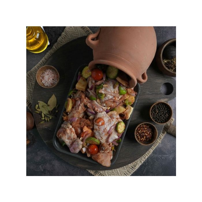 دجاج طازج مع خضار مشكّلة في فخارة يقدم وجبة تقليدية بمذاق أصيل. خيار مثالي للعشاء العائلي أو المناسبات الخاصة.