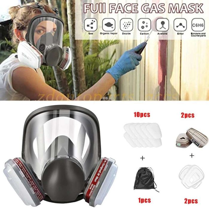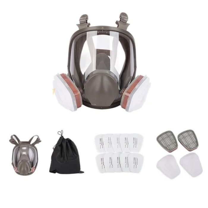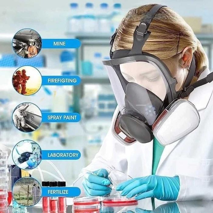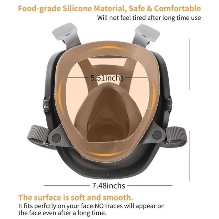 قناع حماية تنفسية كامل الوجه مصنوع من سيليكون آمن على البشرة يوفر حماية شاملة من الغبار والمواد الكيميائية والأبخرة العضوية والمبيدات. نظام تهوية مزدوج يتيح التنفس بسهولة مع رؤية واسعة وشفافة. يناسب العمل في المصانع والمناجم ورش الدهان والمختبرات والزراعة.