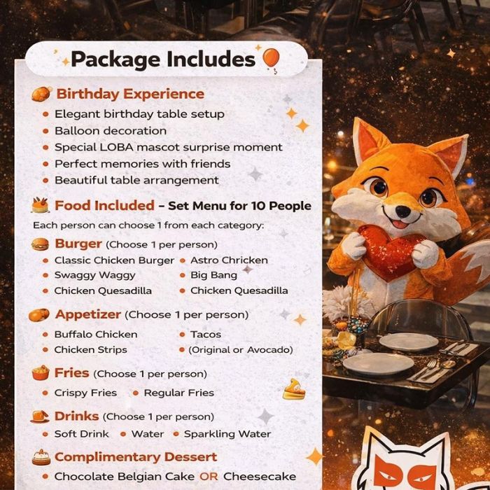 عيد ميلاد ممتع لـ 10 أشخاص مع وجبات البرجر والمشروبات والحلويات من Loba