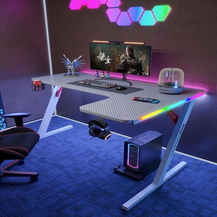 تم تصميمها لكل عشاق ألألعاب الفيديو، مما توفر مساحة واسعة لعدة شاشات وإكسسوارات. الطاولة مصنوعة من مواد عالية الجودة ومتينة بسطح أملس وسهل التنظيف. كما تتضمن لوحة فأرة كبيرة مدمجة تغطي جزءاً كبيراً من سطح الطاولة، مما يوفر مساحة عمل سلسة وفعالة.