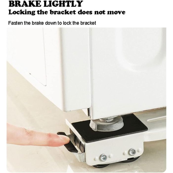 - لا توجد خطوات تثبيت معقدة أو أدوات مطلوبة. ببساطة ضع دعامتين تحت زوايا الثلاجات أو الغسالات أو غسالات الصحون أو المجففات أو الأجهزة المنزلية الأخرى والأثاث، ثم اضغط برفق على الفرامل لتثبيت الدعامة