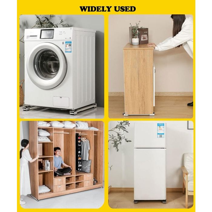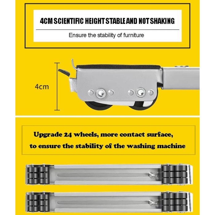 - قاعدة متحركة متعددة الوظائف، مناسبة للمجففات والغسالات والثلاجات ومكيفات الهواء والمعدات الثقيلة وأواني الزهور الكبيرة، ويمكن استخدامها أيضًا للأثاث والأجهزة المنزلية. يمكنك بسهولة نقل هذه الأشياء الثقيلة وتنظيف الجزء السفلي من الأشياء الثقيلة دون الحاجة إلى التثبيت