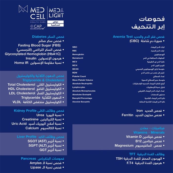 الفحوصات تشمل: فحص فقر الدم والحديد -صورة دم شاملة -كرات الدم البيضاء -كرات الدم الحمراء- الهيموجلوبين- المكونات المختلفة في الدم- خلايا الدم غير الطبيعية -تقييم تكوين الدم -متوسط تركيز الهيموجلوبين الجسيمي -تقيم كل عنصر من عناصر الدم -تعداد الصفائح -متوسط حجم الصفائح الدموية -أنواع الخلايا البيضاء المسببه للإضطرابات -تحليل نسبة الليمفاويات -تعداد كريات الدم البيضاء التفريقي -مستوى الحمضات -خلايا الدم البيضاء القاعدية- خلايا الدم البيضاء القاعدية المطلقه - فحص الحديد- - فحص مخزون الحديد - معادن -فحص فيتامين فحص الماغنيسيوم - وظائف الغدة الدرقية -الهرمون المحفز للغدة الدرقية • هرمون الغدة الدرقية - السكر فحص - فحص سكر صائم -فحص السكر التراكمي (التجسسي)• هرمون الإنسولين -نسبة مقاومة الإنسولين - - فحص الدهون الثلاثية والكوليسترول الكوليسترول الكلي الكوليسترول النافع - الكوليسترول الضار - هون الثلاثية الد - كوليسترول منخفض الكثافة - فحص وظائف الكلى نسبة اليوريا - نسبة الكرياتينين - - نسبة أملاح اليوريك أسيد نسبة الكالسيوم فحص وظائف الكبد -نسبة أنزيم -نسبة أنزيم فحوصات البنكرياس -فحص نسبة الـ Amylas فحص نسبة الــ Lipase