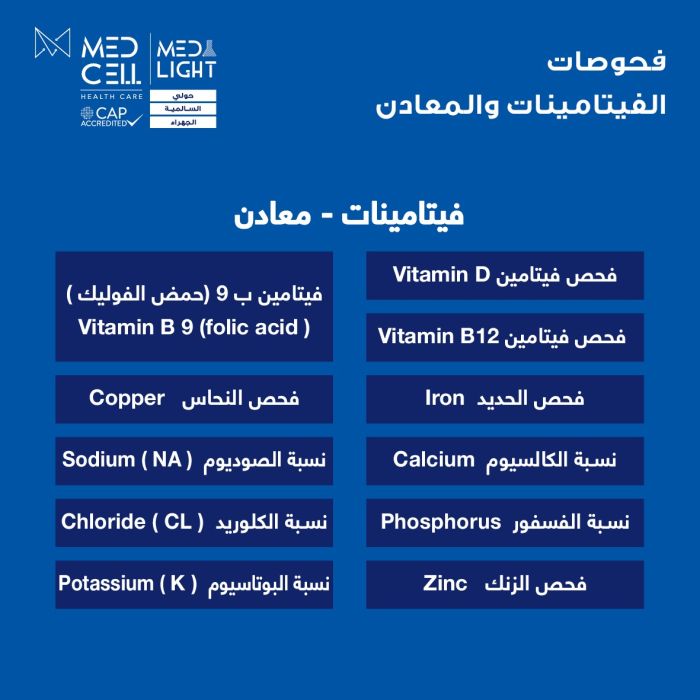 اطلب كود شيييل و احصل على خدمات مميزة لفحوصات الفيتامينات والمعادن المميزة من مختبر Med Light - لمعرفة قيمة الخدمة يرجى الاتصال على المختير