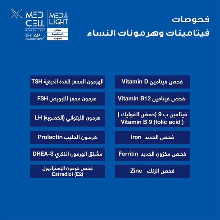 اطلب كود شيييل و احصل على خدمات مميزة لفحوصات فيتامينات وهرمونات النساء من مختبر Med Light - لمعرفة قيمة الخدمة يرجى الاتصال على المختير