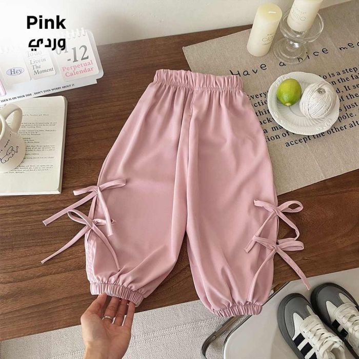 بنطلون بناتي أنيق مع فيونكة مصنوع من قماش ناعم ومريح، يوفر لطفلتك حرية الحركة والراحة طوال اليوم، تصميمه العصري واللون الوردي الجذاب يجعله الخيار المثالي للمناسبات الصيفية، يتميز بخفة وزنه وسهولة التنقل به، مما يجعله قطعة أساسية في خزانة ملابس طفلتك.