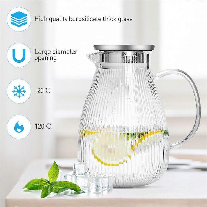إبريق أنيق وعملي للاستخدام اليومي بميزة صب أذكى وأسهل. مصنوع من زجاج بوروسيليكات متين مع غطاء من الستانلس ستيل المخصص للأدوات الغذائية، ليكون مناسباً للمشروبات الباردة والساخنة مع مظهر مرتب على السفرة أو داخل الثلاجة. الغطاء يوفر خيارين للصب، فتحة واسعة لصب الماء والعصير بسهولة، وفتحة بشبكة دقيقة تساعد على تصفية أوراق الشاي أو بقايا الفاكهة. فتحة علوية واسعة تسهّل التنظيف، ومع مفرش لباد يساعد على الثبات وتقليل الانزلاق يصبح اختياراً عملياً للاستخدام المتكرر.