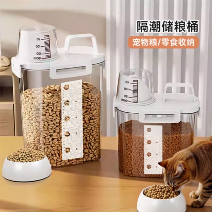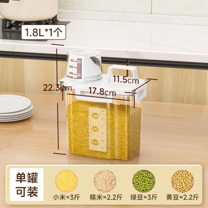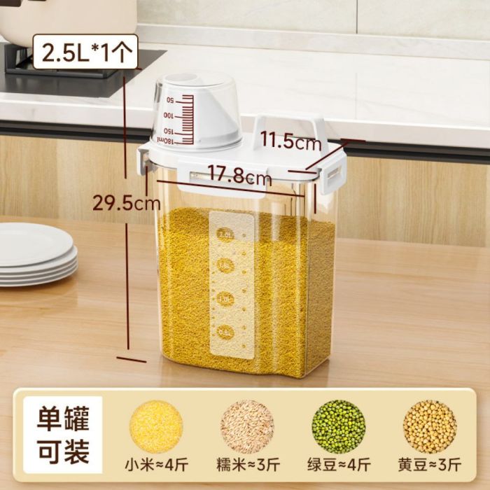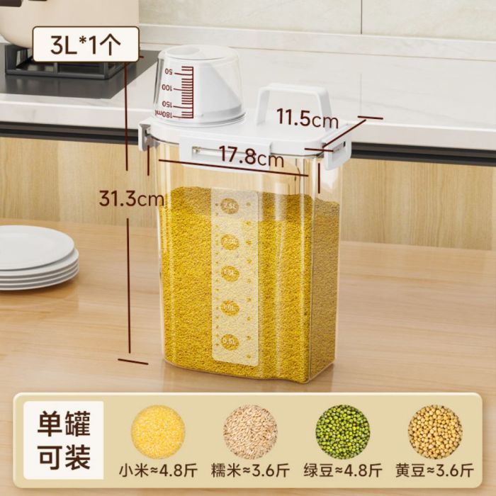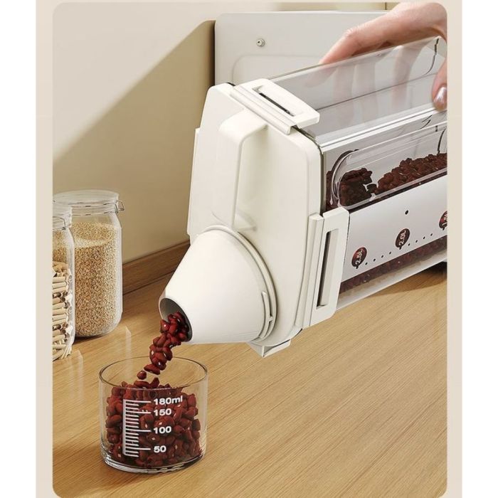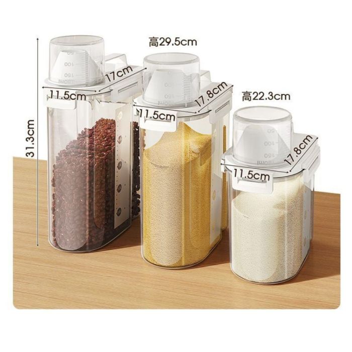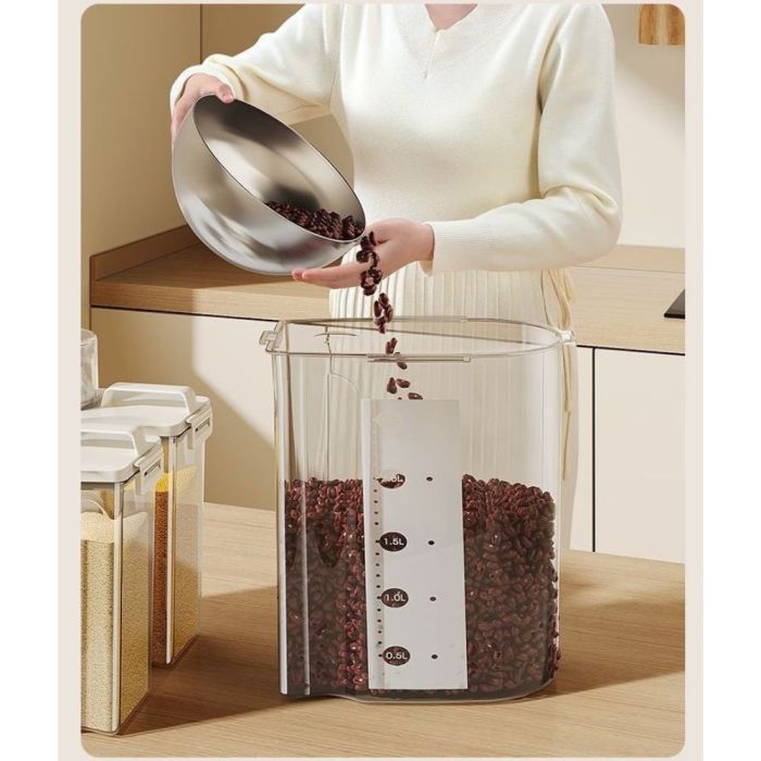 علبة تخزين الحبوب مع كوب قياس مصنوعة من بلاستيك غذائي شفاف عالي الجودة، توفر إغلاقًا محكمًا يساعد على حماية الحبوب من الرطوبة والهواء، تصميمها العملي يسهل الاستخدام اليومي مع تنظيم أنيق ورؤية واضحة للمحتوى ويحافظ على جودته أثناء التخزين