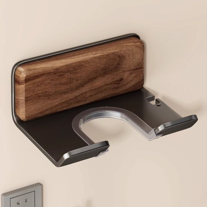 ستاند مجفف شعر مصنوع من خشب الجوز والألومنيوم، تثبيت بدون حفر يمنحك ترتيب آمن، يحافظ على مجفف الشعر ثابت ومنظم، يضيف لمسة عصرية أنيقة لحمامك