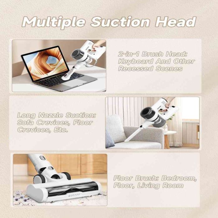 - رؤوس تنظيف متعددة الاستخدامات تتيح تنظيف الفجوات، لوحات المفاتيح، الأرضيات، والأثاث بسهولة
