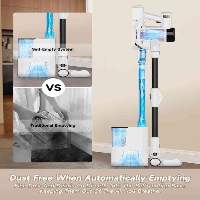 - محطة تفريغ ذاتي وتقنية خالية من الغبار تفرغ الأوساخ تلقائيًا في قاعدة محكمة، مثالية لمن يعانون من الحساسية
