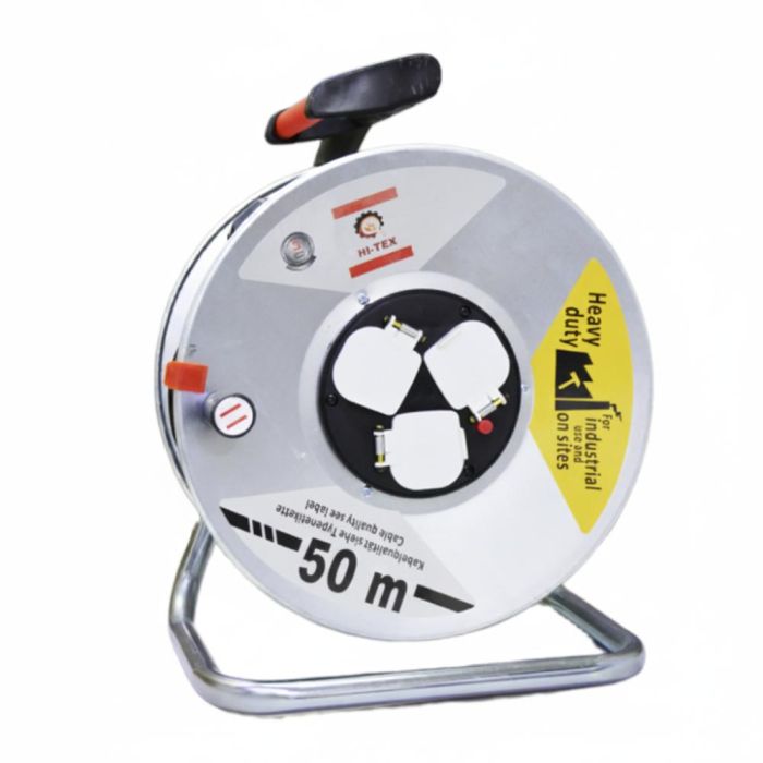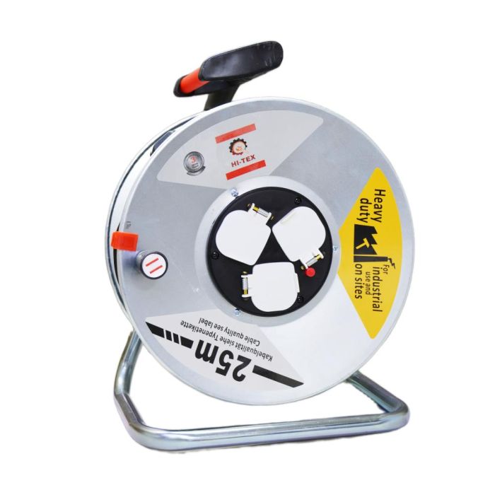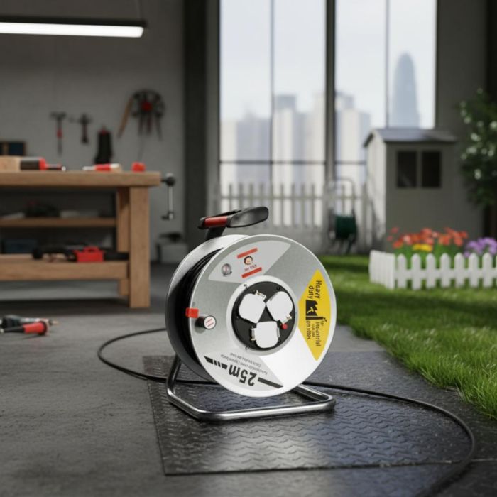 بكرة كيبل كهربائي متينة بطول 25 أو 50 متر مع 3 مقابس مقاومة للعوامل الجوية وحماية حرارية، مثالية للاستخدام الصناعي ومواقع البناء.