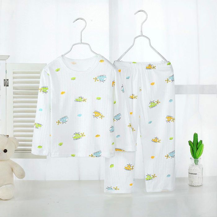 طقم بيجامة صيفي أنيق ومريح للأطفال مكون من قطعتين، تي شيرت بأكمام طويلة وسروال. مصنوع من القطن الخالص ليكون ناعمًا وخفيفًا. يتميز بتصميم عصري وبسيط بطبعة مميزة تضفي لمسة ساحرة على إطلالة طفلك.صفقة اليوم هي طقم بيجامة صيفي بأكمام طويلة من القطن الخالص بطبعة هليكوبتر للأولاد والبنات