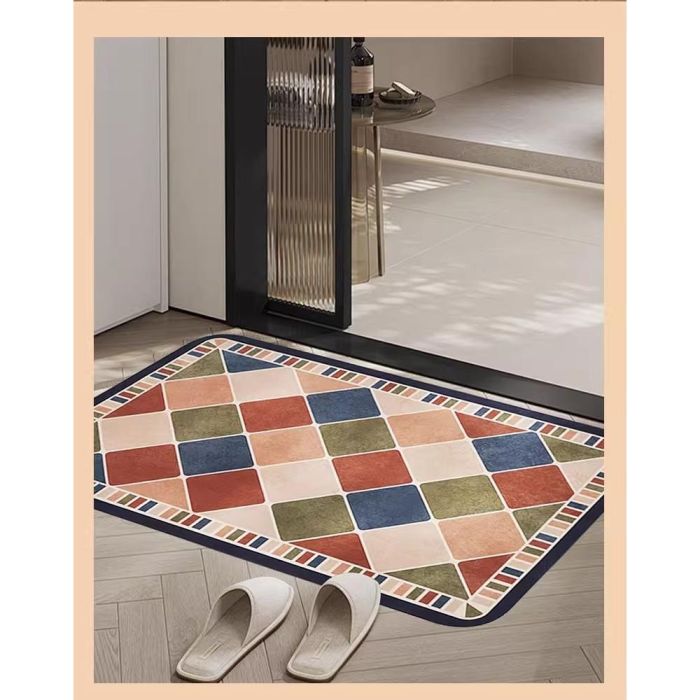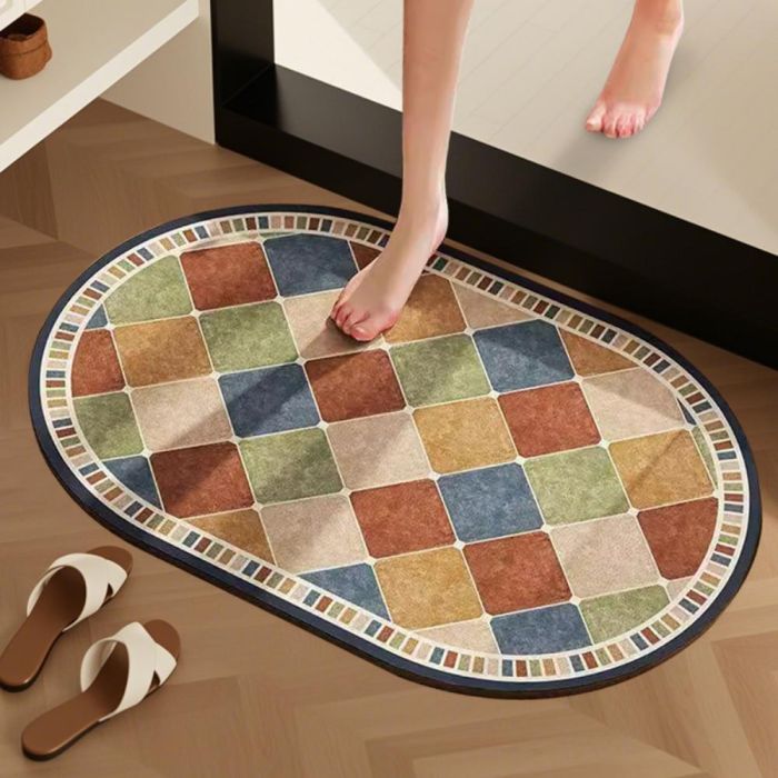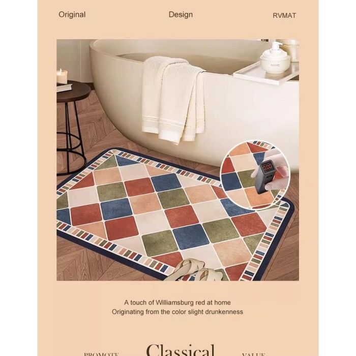 سجادة حمام عالية الامتصاص بتصميم ملون مصنوعة من خامة دياتوم فعالة، تضفي لمسة أنيقة على مساحتك، تمتص الماء بسرعة وتجف سريعاً، تمنح قدميك شعوراً ناعماً وتوفر ثباتاً آمناً