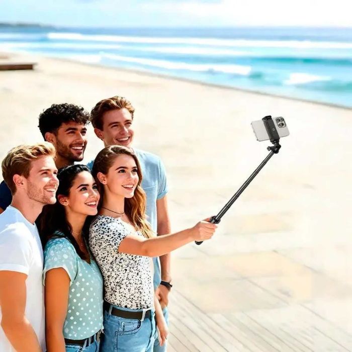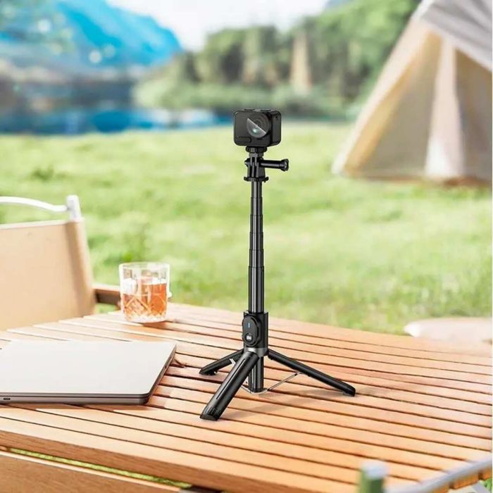 ستاند ثلاثي وعصاية سيلفي متعددة الاستخدامات مصممة لتوفير الثبات والمرونة أثناء التصوير والتسجيل وصناعة المحتوى. تأتي بعصا تلسكوبية مصنوعة من سبائك الألومنيوم يمكن تمديدها حتى حوالي 95 سم، مما يسمح بالتقاط صور واسعة وزوايا مختلفة بسهولة. يجمع الجهاز بين وظيفة عصاية السيلفي والحامل الثلاثي المستقر المزود بقاعدة مانعة للانزلاق، مما يجعله مناسبًا للاستخدام اليدوي أو بدون استخدام اليدين. كما يحتوي على ريموت بلوتوث قابل للفصل بمدى يصل إلى 10 أمتار، مما يتيح التقاط الصور والفيديو عن بُعد بسهولة.