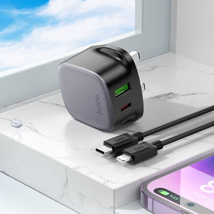قم بتزويد أجهزتك بالطاقة بأناقة مع شاحن Hoco Rich ثنائي المنفذ. يتميز هذا الشاحن الصغير بمنفذ PD بقوة 20 واط Type-C ومنفذ USB-A بقوة 18 واط QC3.0، ويوفر شحنًا فائق السرعة لجميع أدواتك. متوافق مع بروتوكولات PD20W وPPS وQC3.0 وFCP وAFC، وهو مثالي لأجهزة iPhone والهواتف التي تعمل بنظام Android والتابلت. مصنوع من مواد مقاومة للهب وتصميم أنيق، ومثالي للمنزل أو المكتب أو السفر.