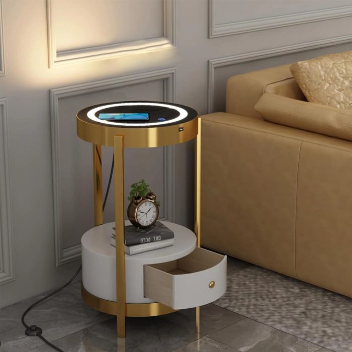 طاولة سرير جانبية مضيئة مع شاحن هاتف لاسلكي ومساحة تخزين