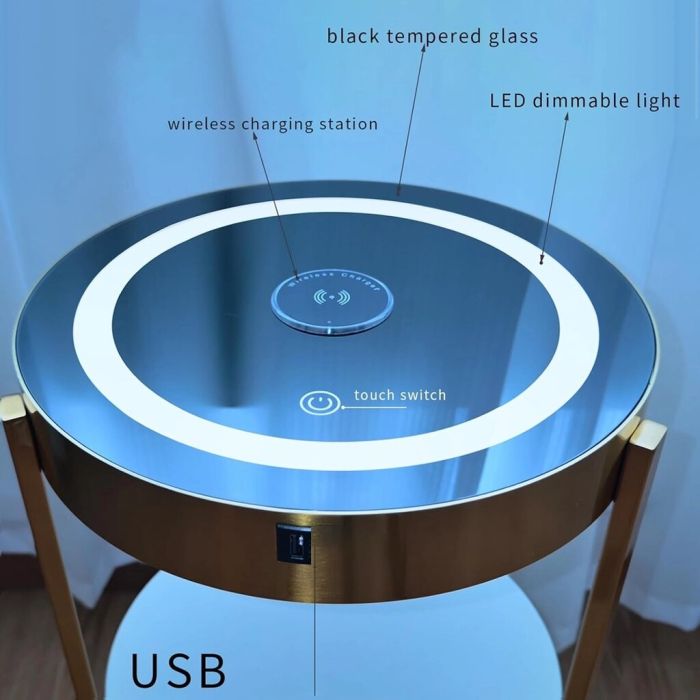 - طاولة سرير جانبية مضيئة مع شاحن هاتف لاسلكي ومساحة تخزين