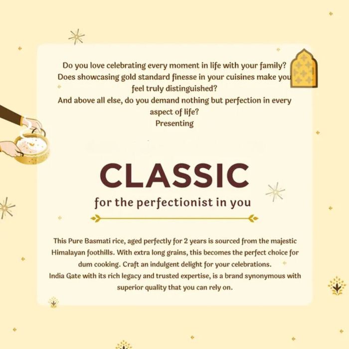 بلغني عند التوفردلّل حواسك واستمتع بالمذاق الرائع لأرز بسمتي كلاسيك سوبريم من India Gate. يشتهر هذا الأرز طويل الحبة الذي ينمو في سفوح جبال الهيمالايا بجودته الفائقة وطعمه الأصيل ورائحته العطرة، ما يجعله عنصراً أساسياً لجميع المطابخ في أنحاء العالم