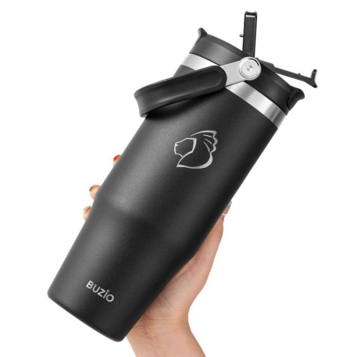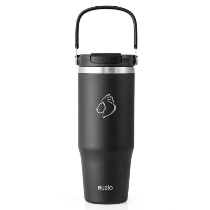 كوب معزول بغطاء ومقبض سعة 1.2 لتر من BUZIO مصنوع من ستانلس ستيل 18/8، يحافظ على المشروبات ساخنة أو باردة لفترات طويلة، مزود بغطاء 2 في 1 مع شفاط وفوهة، تصميم مريح وقاعدة نحيفة تناسب الستاند، سهل الاستخدام والتنظيف