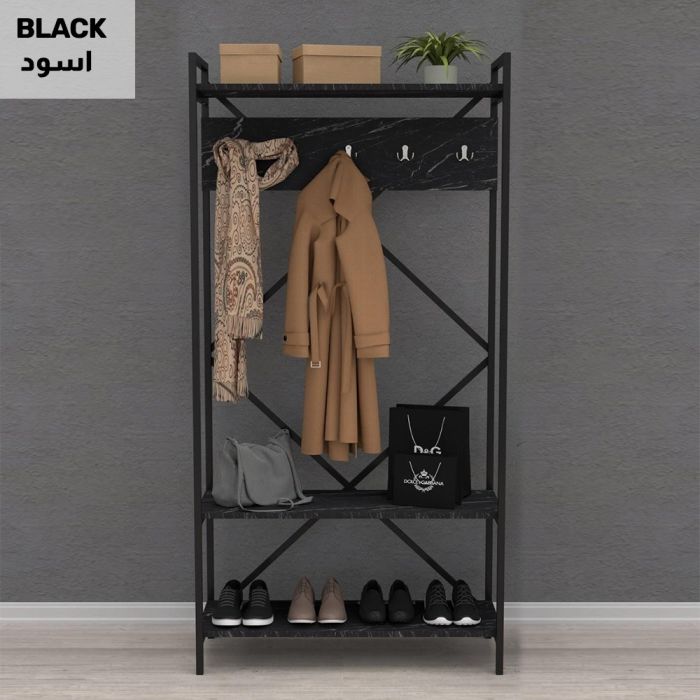 - هيكل حديدي قوي مع أرفف خشبية وعلاقات