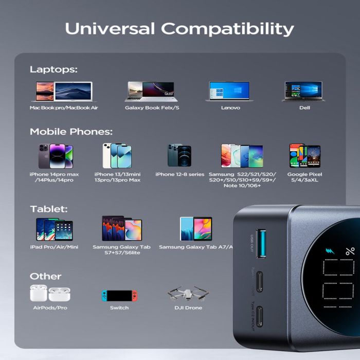 اشحن أجهزتك بسرعات فائقة مع البطارية الاحتياطية بقوة 65 واط بفضل سعتها الهائلة البالغة 30000 مللي أمبير، توفر طاقة موثوقة تدوم لرحلات طويلة والاستخدام المكثف. يسمح منفذ USB-C ثنائي الاتجاه بقوة 65 واط ليس فقط بالشحن السريع للابتوب، بل أيضًا بإعادة شحن البطارية نفسها بالكامل في ساعتين فقط مع ثلاثة منافذ إخراج (اثنين Type-C وواحد USB-A)، يمكنك شحن ما يصل إلى ثلاثة أجهزة بسرعة في وقت واحد. توفر شاشة LCD الكبيرة عرضًا دقيقا لمستوى البطارية وحالة الشحن