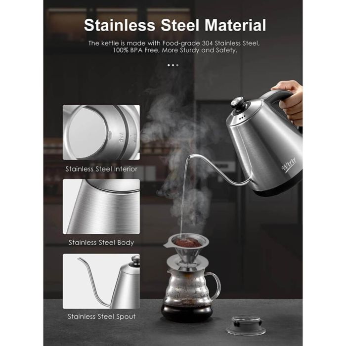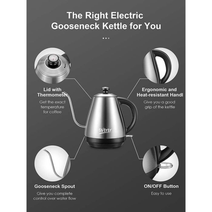 غلاية Wtrtr الكهربائية بعنق الإوزة توفر لك دقة وتحكمًا مثاليًا في تحضير الشاي والقهوة. تم تصميم الفوهة المعقوفة لمنع التنقيط وتوجيه تدفق الماء بدقة. تأتي الغلاية مزودة بمقياس حرارة لعرض درجة حرارة التخمير المثالية، ما يجعلها مثالية للقهوة والشاي. مع خاصية الإيقاف التلقائي وحماية من الغليان الجاف، تضمن لك الأمان أثناء الاستخدام. يتم تسخين الماء بسرعة (2-4 دقائق فقط) بفضل القوة 2200 واط. هيكل من استانلس ستيل 304 مع مقبض مريح وآمن.
