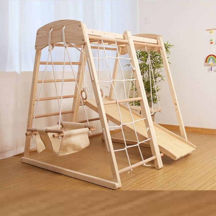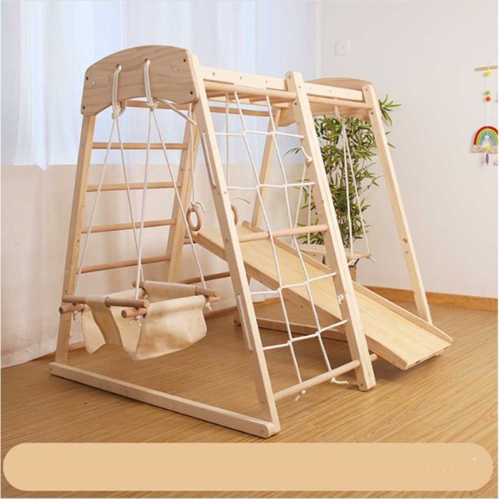إطار تسلق للأطفال مع 2 أرجوحة يقدم تجربة لعب آمنة بفضل الزوايا المستديرة والهيكل الخشبي المتين، ويجمع بين التسلق، والانزلاق، والتأرجح، وتنمية التوازن. يضم منزلقًا مزدوجًا، شبكة تسلق، أرجوحتين قماشيّتين، وحلقات خشبية، مما يساعد الأطفال على تعزيز القوة والمرونة في بيئة لعب ممتعة.