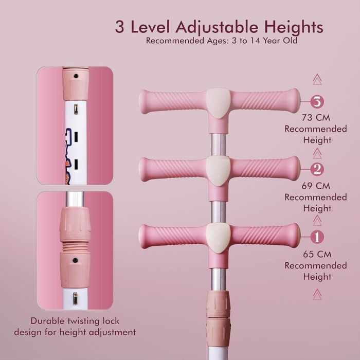 - أنبوب المقود على شكل حرف T من سبائك الألومنيوم مصمم بقفل رفع ولف آمن. لإضاءته، عليك التحرك به، حيث تضيء مصابيح LED أثناء المشي.