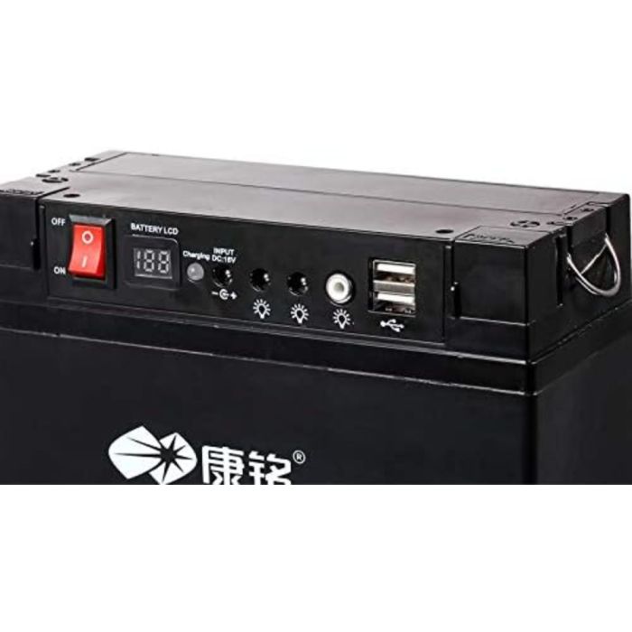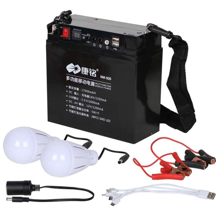 محطة طاقة محمولة متعددة الوظائف KM-920 بسعة 17000 مل أمبير مصنوعة من هيكل متين عالي الجودة، توفر طاقة موثوقة لتشغيل الإضاءة وشحن الأجهزة، مزودة بمخارج متعددة ولمبات LED، مثالية للتخييم والطوارئ وسهلة النقل والاستخدام