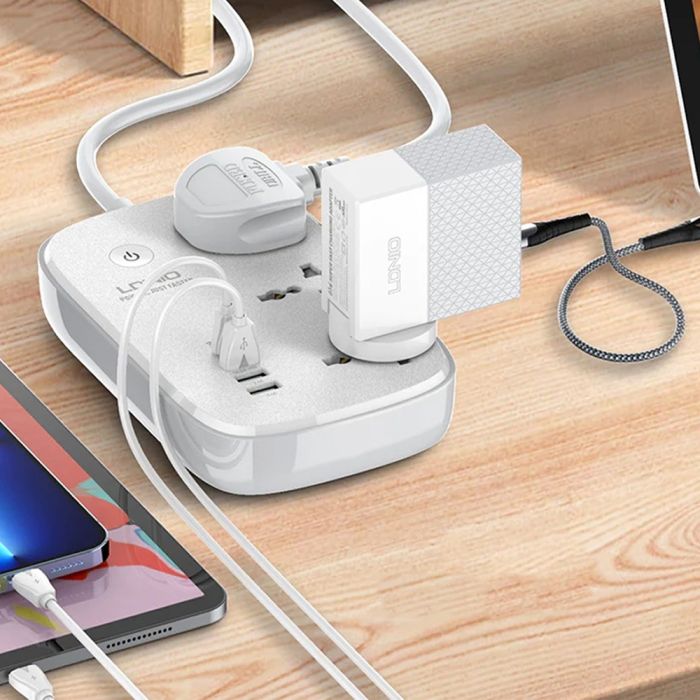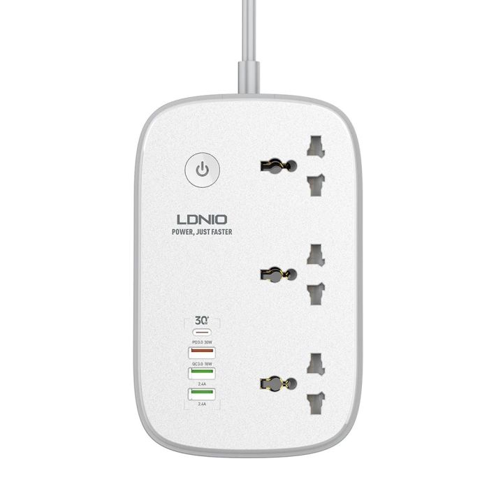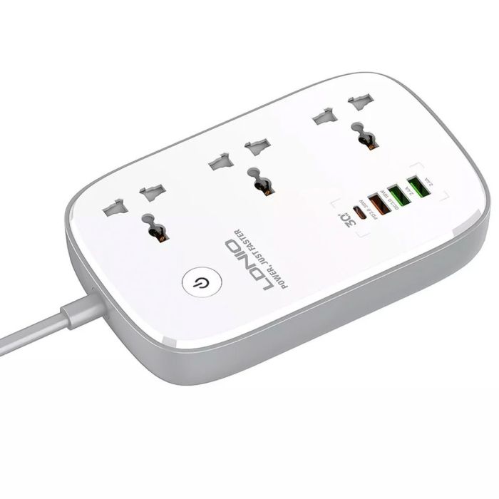 - وصلة اشتراك كهربائية 3 منافذ كهربائية + 1 منفذ PD و 1 منفذ QC و 2 منفذ USB - أبيض من LDNIO