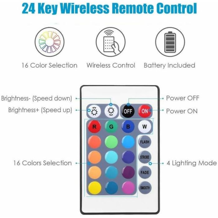 - يتيح لك جهاز التحكم عن بعد بالأشعة تحت الحمراء المزود بـ 24 مفتاحًا والمرفق مع هذه الأضواء الشريطية إدارة شريط LED بسهولة من مسافة بعيدة. اضبط الألوان والأوضاع والسطوع بسهولة