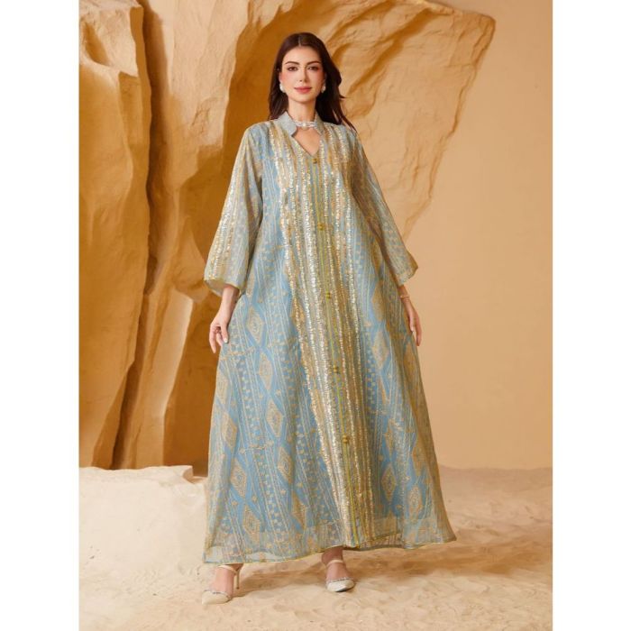 - يتميز بتصميم فضفاض مطرز بالترتر يمنح إطلالة فاخرة ولافتة