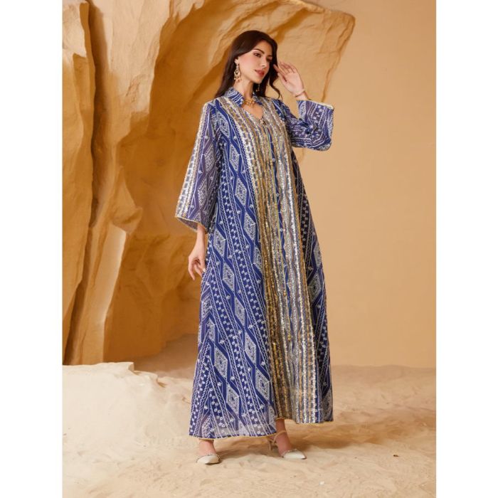 فستان فضفاض مطرز بالترتر للسيدات مصنوع من بوليستر بلمسة شبكية أنيقة، بتصميم واسع ينساب برقي، التطريز اللامع يضيف فخامة جذابة، يمنح إطلالة أنثوية راقية تناسب المناسبات الخاصة والسهرات الراقية