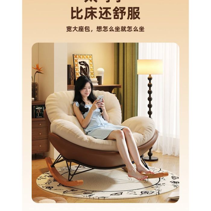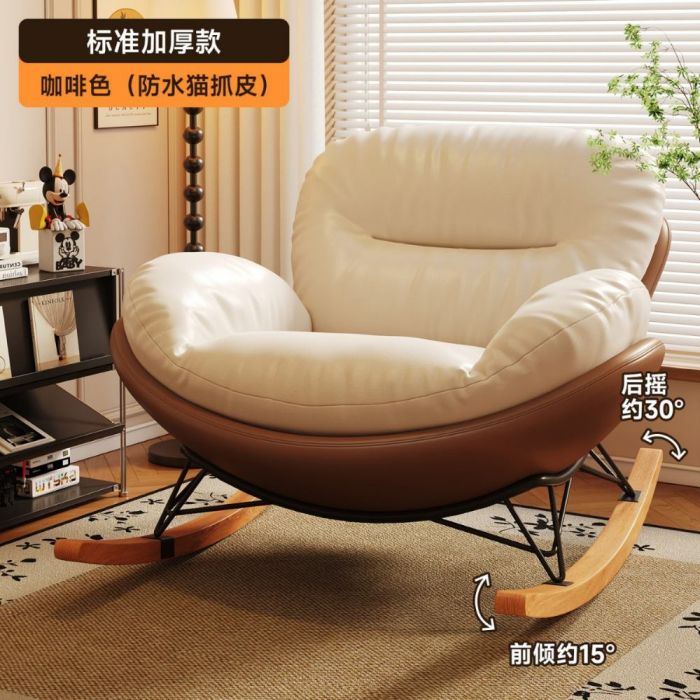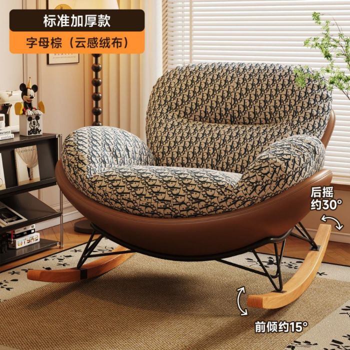 كرسي استرخاء فاخر مبطن مصنوع من خامات ناعمة داعمة، يمنح جلوساً عميقاً ومريحاً مع حشو ممتلئ يحافظ على جودته، قاعدة هزازة ثابتة بحركة سلسة، تصميم أنيق يعزز أجواء الراحة في المنزل