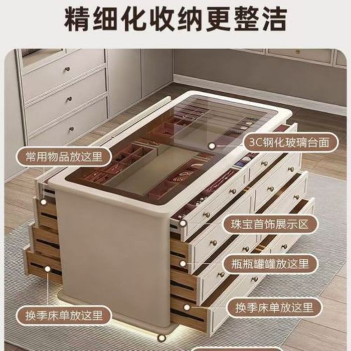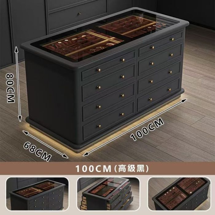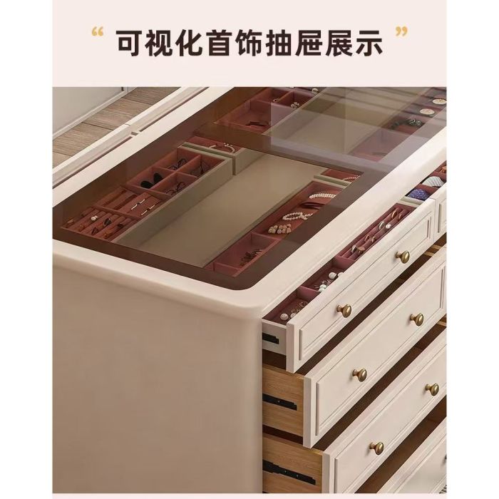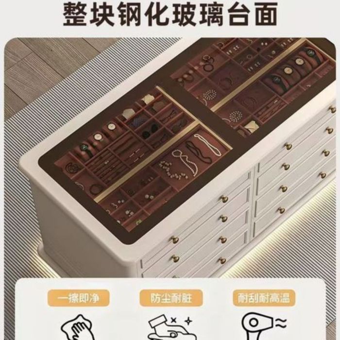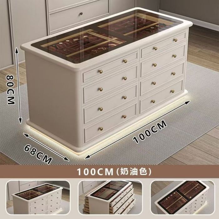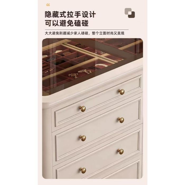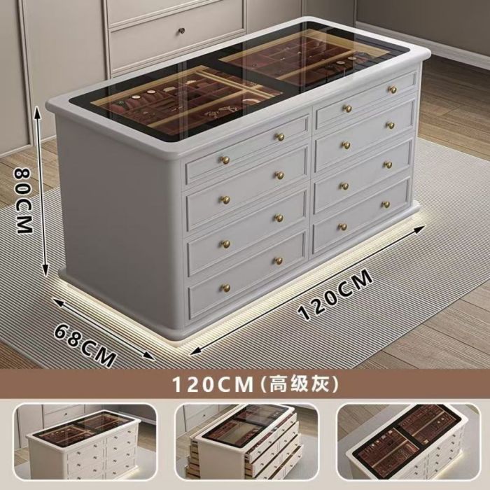 منظم مجوهرات فاخر من الخشب الصلب بسطح زجاجي 4 طبقات، يوفر عرضاً أنيقاً مع أدراج متعددة وتقسيمات منظمة، تصميم راقٍ يعزز ترتيب غرفة النوم ويحافظ على مقتنياتك بأناقة