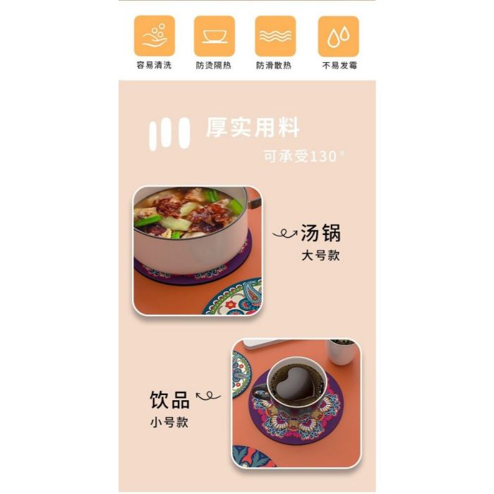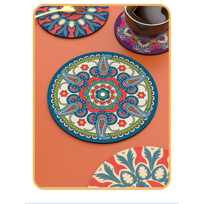 حصيرة طاولة عازلة للحرارة بتصميم ماندالا مصنوعة من خامة متينة، تمنح حماية فعالة لسطح الطاولة، مانعة للانزلاق وسهلة التنظيف، مناسبة للتقديم اليومي والمشروبات الساخنة، وتضفي لمسة جمالية أنيقة على المكان