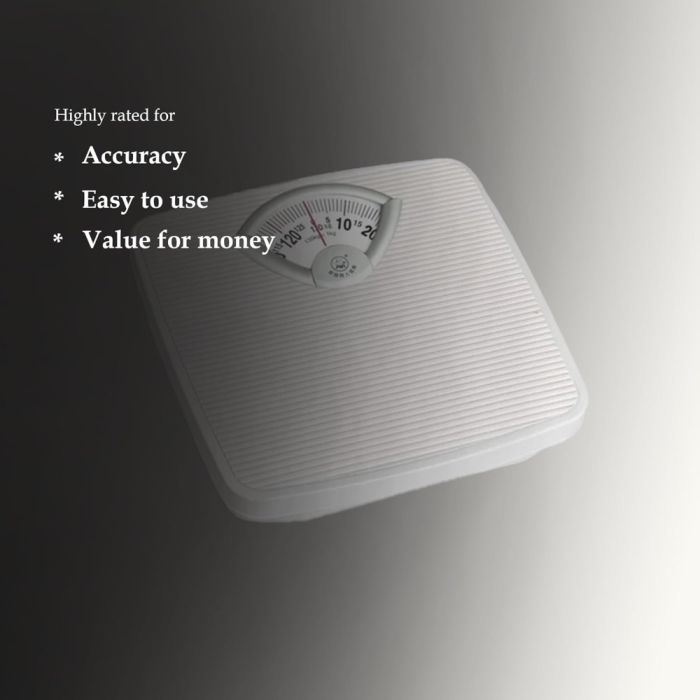 قياس دقيق وموثوق للوزن يصل إلى 130 كجم مع ميزان ميكانيكي يقدم أداء ثابت دون الحاجة إلى بطاريات. مصنوع من مواد متينة لضمان استخدام طويل الأمد. تصميمه الكلاسيكي يناسب أي مساحة، ويتميز بقرص سهل القراءة لعرض الوزن بسهولة وسرعة.