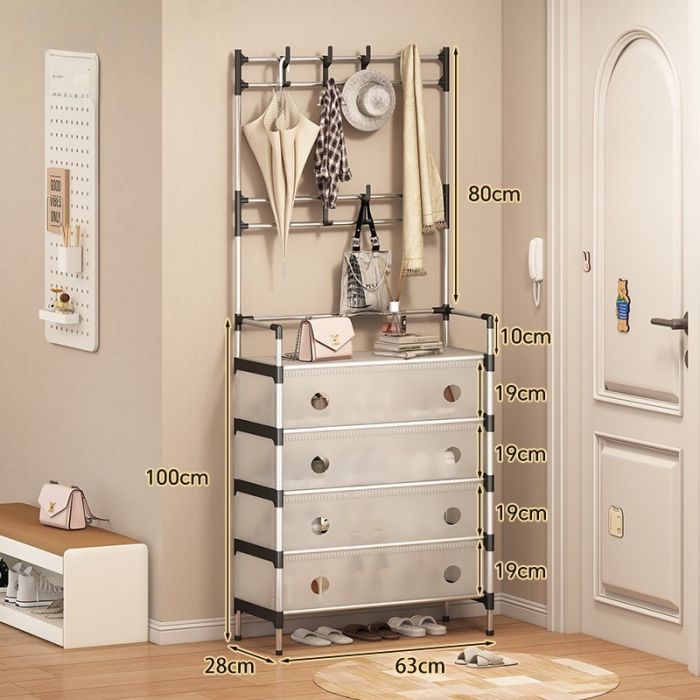 وداعاً لبعثرة الأحذية عند مدخل المنزل! إليكِ المنظم المتكامل الذي يجمع بين السعة الكبيرة والتصميم العمودي الموفر للمساحة. هذا المنظم المكون من 5 طوابق معدنية لا يكتفي بترتيب أحذيتك فحسب، بل يأتي مزوداً بـ غطاء قماشي يحمي مقتنياتك من الغبار ويحافظ على مظهر المكان مرتباً ونظيفاً. تم تزويده بعلاقات جانبية ذكية لتعليق المظلات، الحقائب، أو المفاتيح، مما يجعله قطعة أثاث عملية جداً لمدخل المنزل أو غرفة الملابس.
