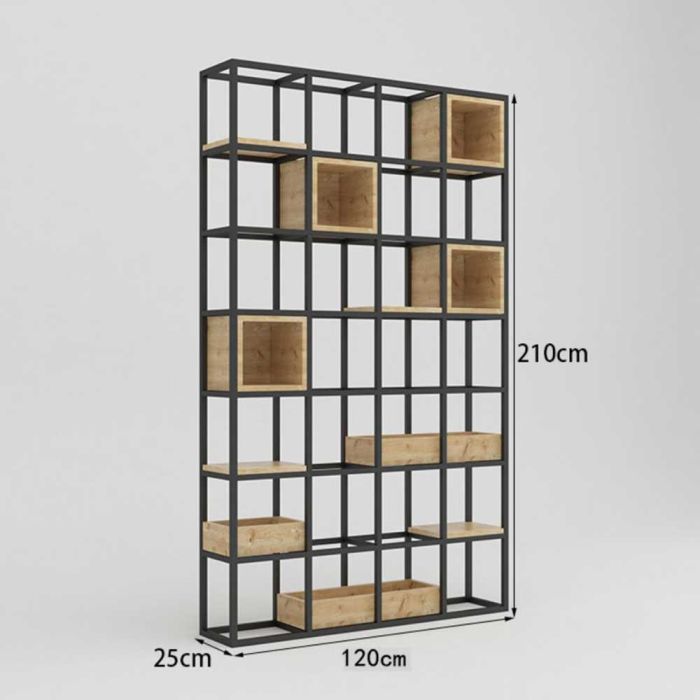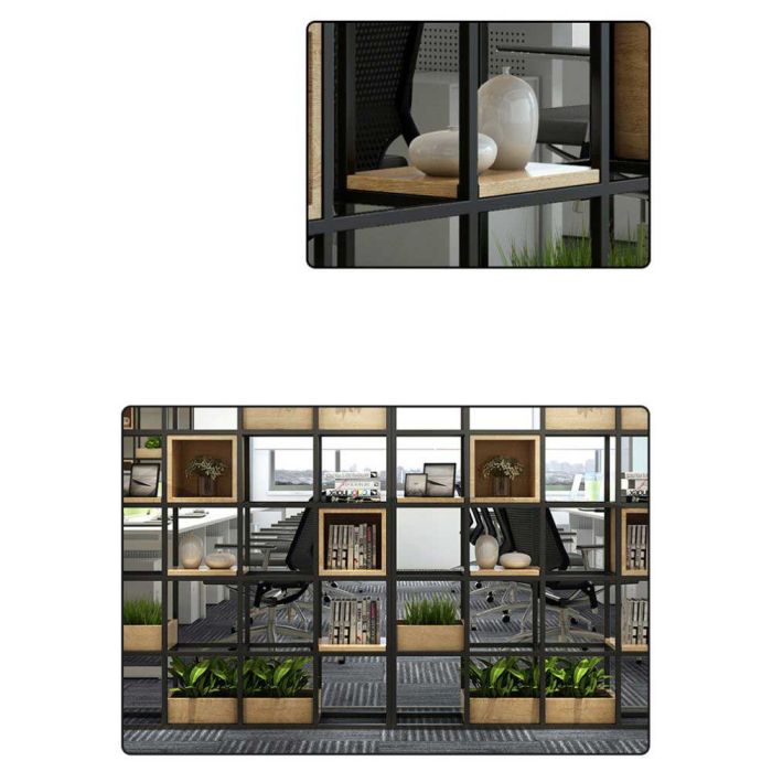 وحدة عرض وتخزين معدنية وخشبية مصنوعة من هيكل معدني متين مع عناصر خشب طبيعي، بتصميم عصري مفتوح يبرز القطع المعروضة وينظم الأغراض بشكل أنيق، مناسبة للمكاتب وغرف المعيشة والمساحات المفتوحة