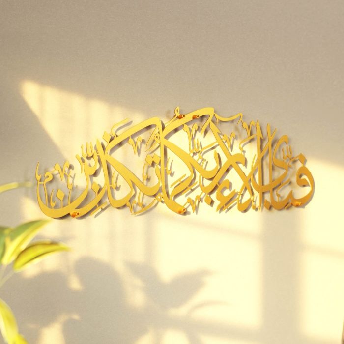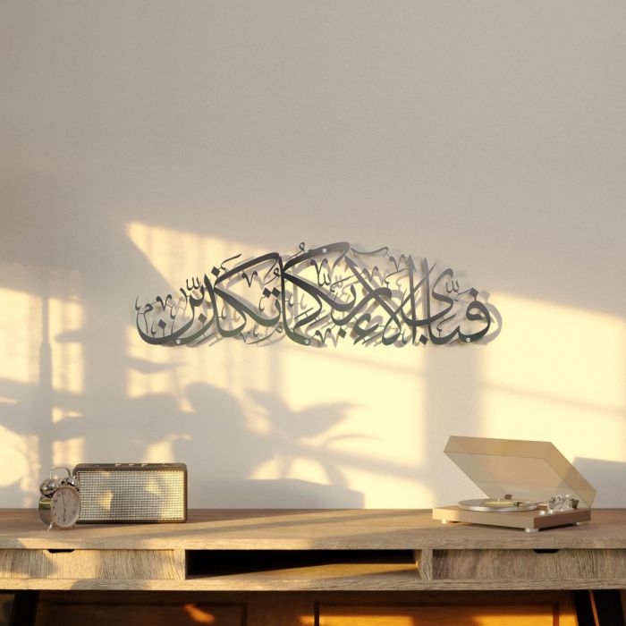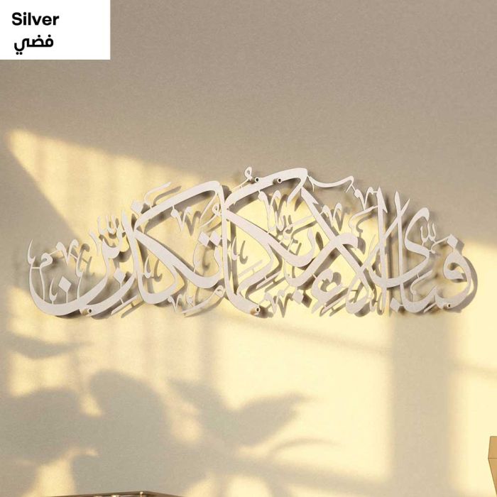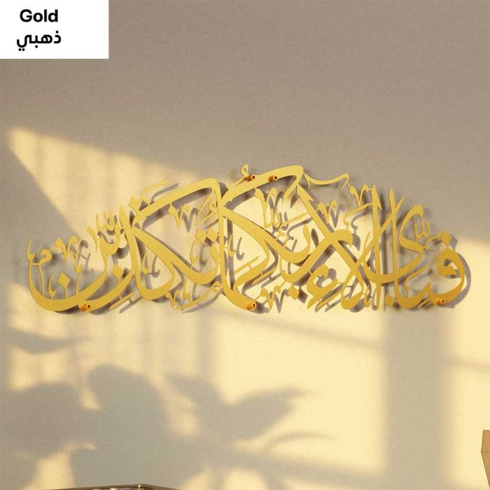 لوحة جدارية معدنية كبيرة آية "فَبِأَيِّ آلاءِ رَبِّكُمَا تُكَذِّبَانِ" بالخط العربي 69 × 20 سم