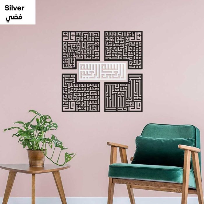 صفقة اليوم هي لوحة جدارية معدنية سورة الإخلاص، الكافرون، الفلق، والناس بالخط الكوفي 90 × 90 سم