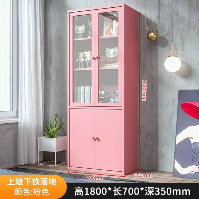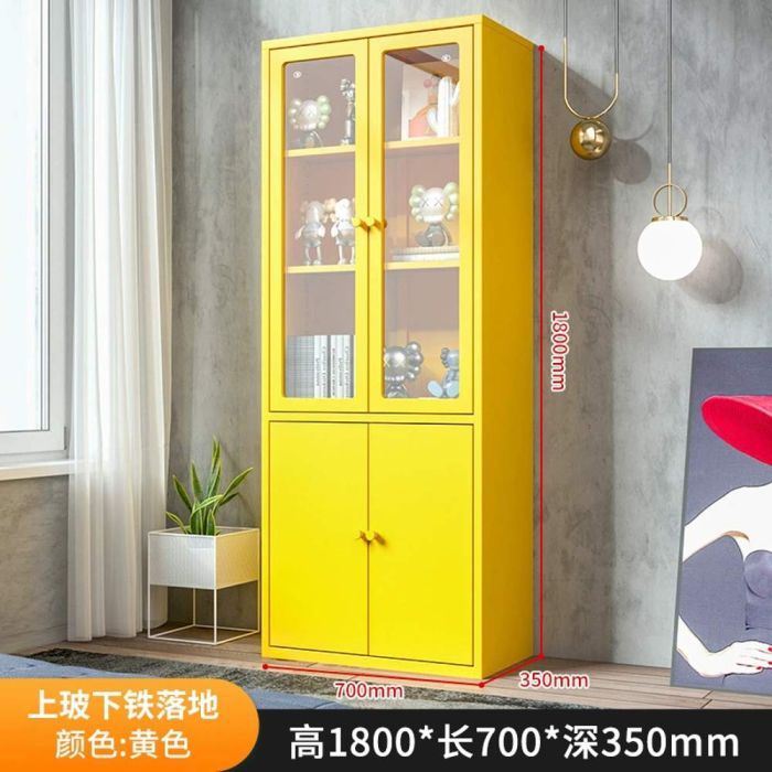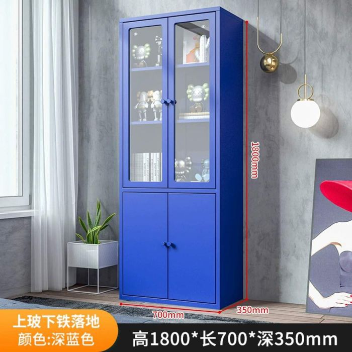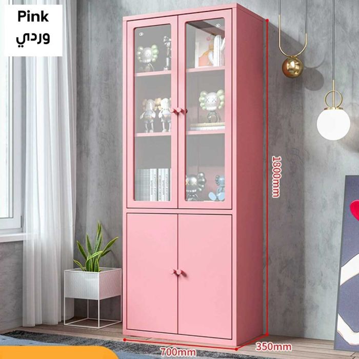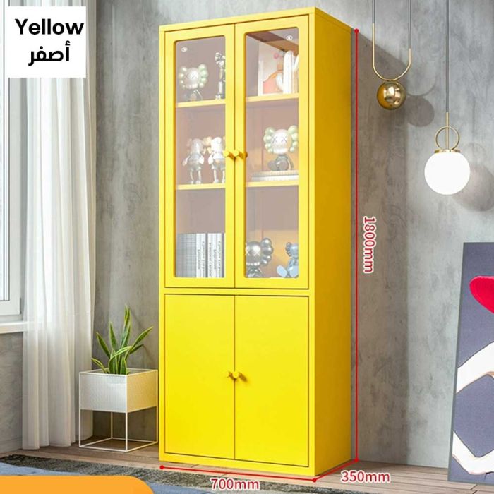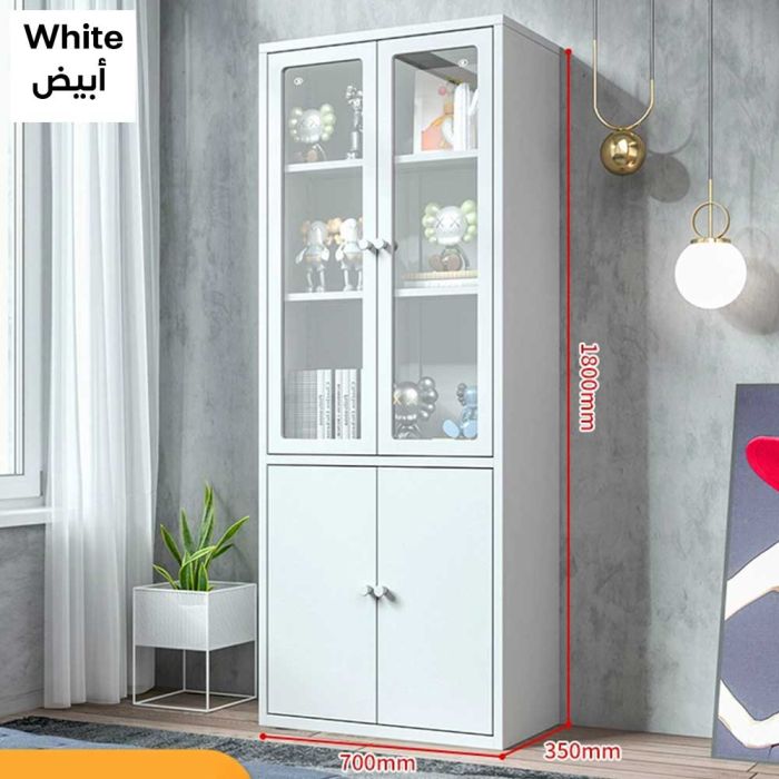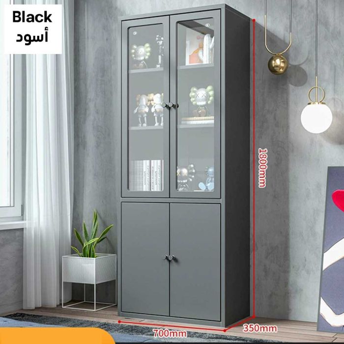- الخامة: هيكل معدني مع أبواب زجاجية علوية وأبواب سفلية مغلقة