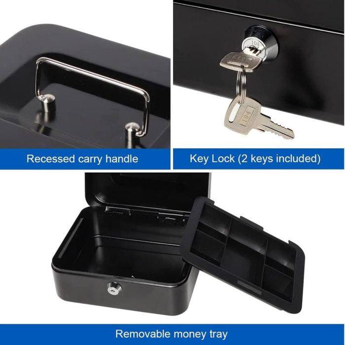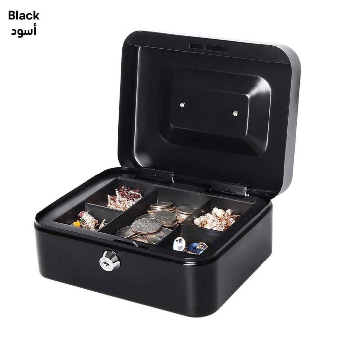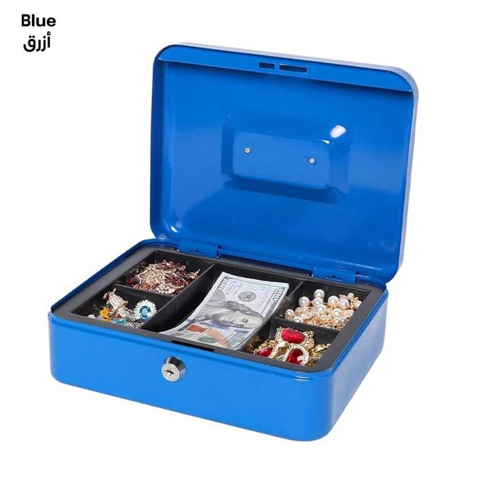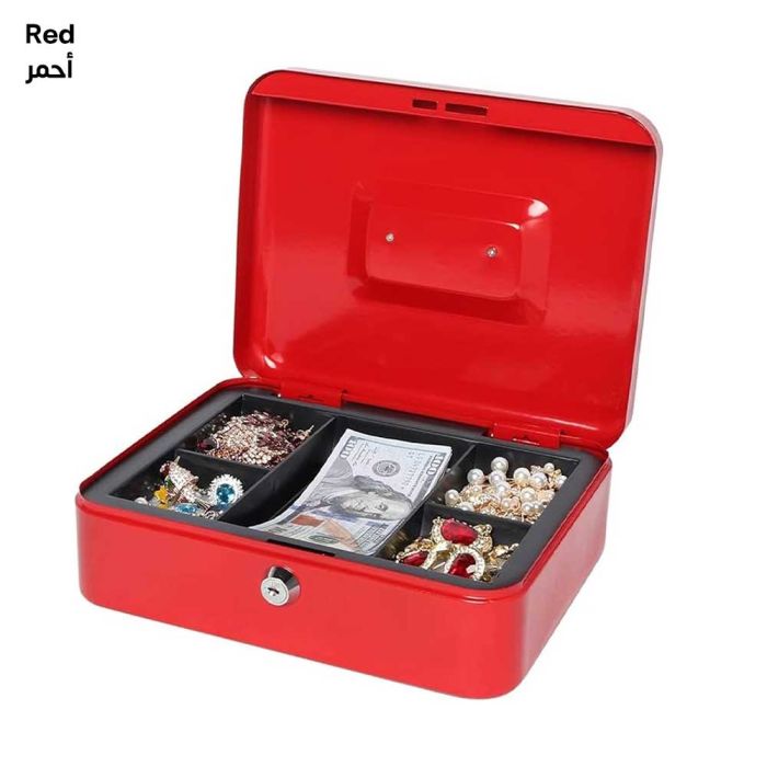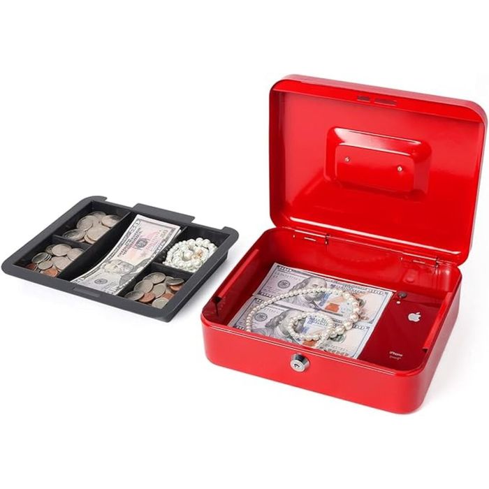 صندوق نقدي معدني متين مزود بقفل آمن وصينية نقود قابلة للإزالة، مثالي لتنظيم الأموال، العملات والمقتنيات الثمينة. مثالي للشركات، المكاتب، أو الاستخدام الشخصي، مع أمان محسن وسهولة في الحمل.