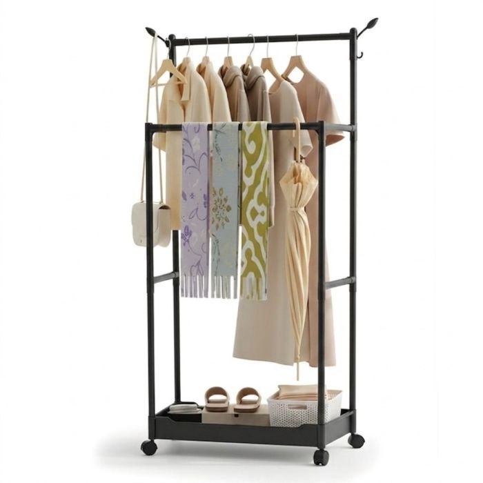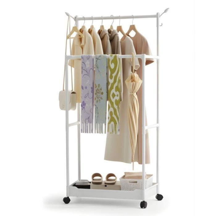 امنح منزلك ترتيبًا فائقًا مع منظم الملابس مزدوج الأعمدة. يحتوي على مستويات متعددة لتعليق الملابس والأرفف السفلية لتخزين الأحذية أو الأغراض الأخرى، مع علاقات جانبية لتعليق الحقائب والقبعات والإكسسوارات. التصميم مزود بعجلات لنقل المنظم بسهولة ورؤوس دائرية للملابس تمنع الانزلاق، ليجمع بين القوة، العملية، والأناقة في مكان واحد.