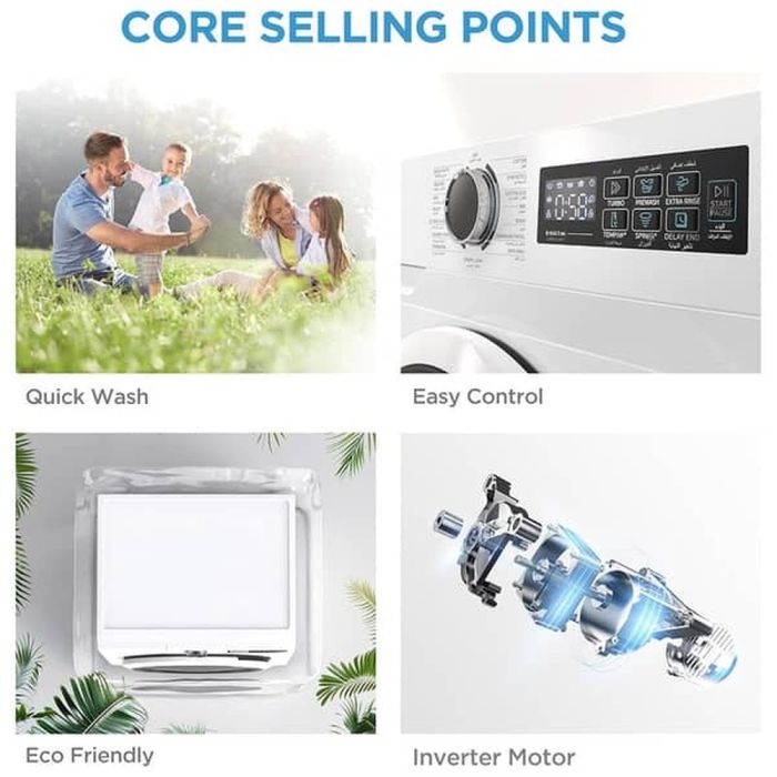 ملابس نظيفة بأقل جهد وأعلى كفاءة! تضمن لك الغسالة الأمامية تجربة غسيل هادئة وقوية بفضل محركها المبتكر. حافظ على جودة ملابسك وتمتع بتوفير كبير في فواتير الطاقة والمياه.