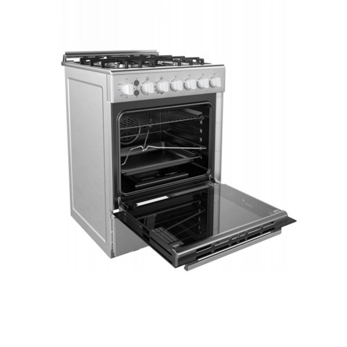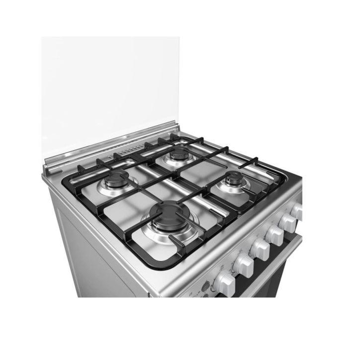 طباخ غاز عملي بأربع شعلات مع فرن وشواية، تصميم ستانلس ستيل عصري مع غطاء زجاجي وأداء موثوق للطهي اليومي.