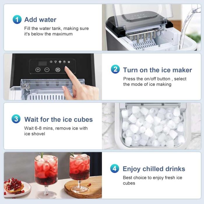 حبات صغيرة من المرح في مشروباتك! أحصل على مشروبات باردة في الوقت الذي تريده مع صانعة الثلج من Miralux، مثالية لكل شيء بدءًا من الكوكتيلات الطازجة وحتى الميلك شيك اللذيذ حيث أنها توفر مكعبات كبيرة وصغيرة تناسب احتياجاتك، مع تشغيلها سهل الاستخدام وقدرات التبريد الفائقة، لن تضطر إلى الانتظار طويلاً لأنها تقوم بصنع 9 مكعبات ثلج في 6 دقائق فقط، مجهزة بأجهزة استشعار متقدمة تعمل على إيقاف إنتاج الثلج عندما تكون السلة ممتلئة أو عندما يكون مستوى الماء منخفضاً مما يمنع التدفق الزائد، لوحة لمس إلكترونية، صغيرة الحجم وخفيفة الوزن، تناسب تماماً وضعها على أي طاولة
